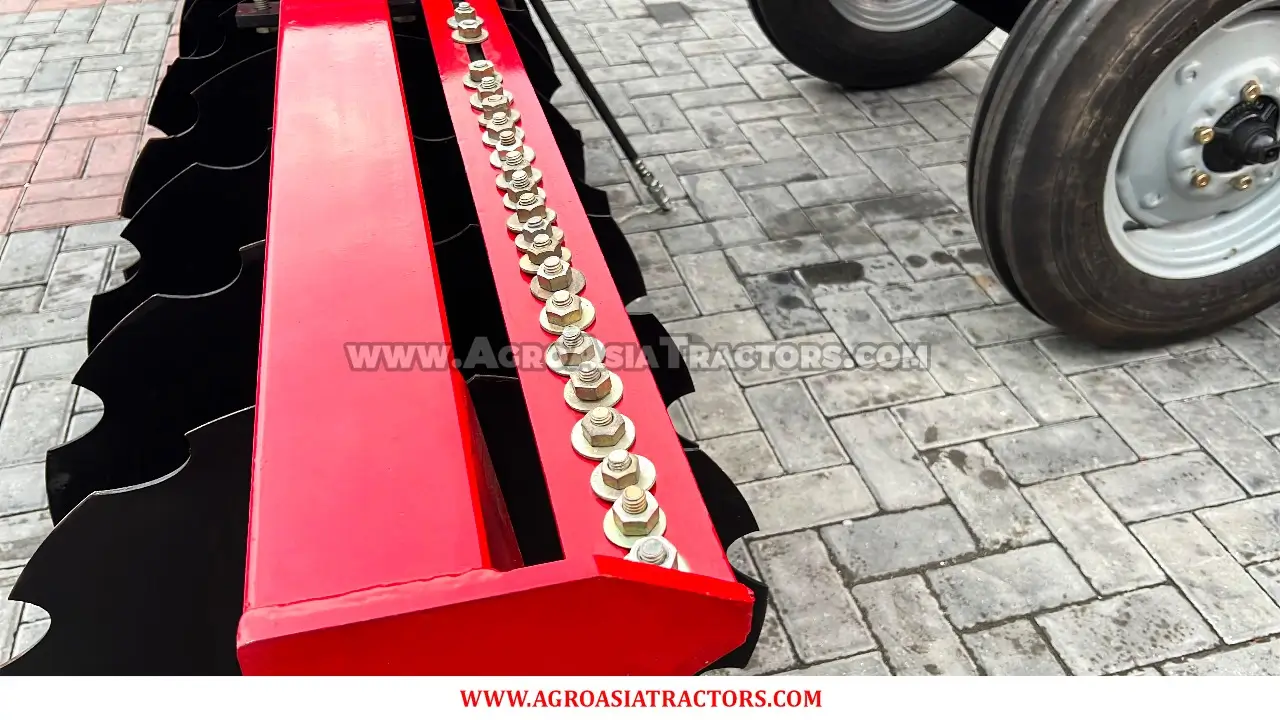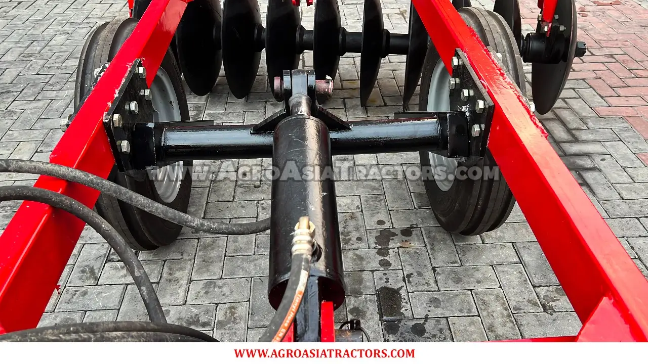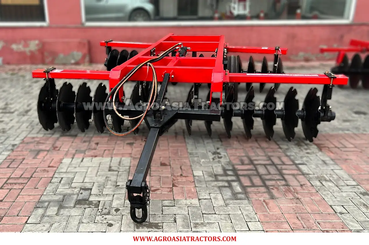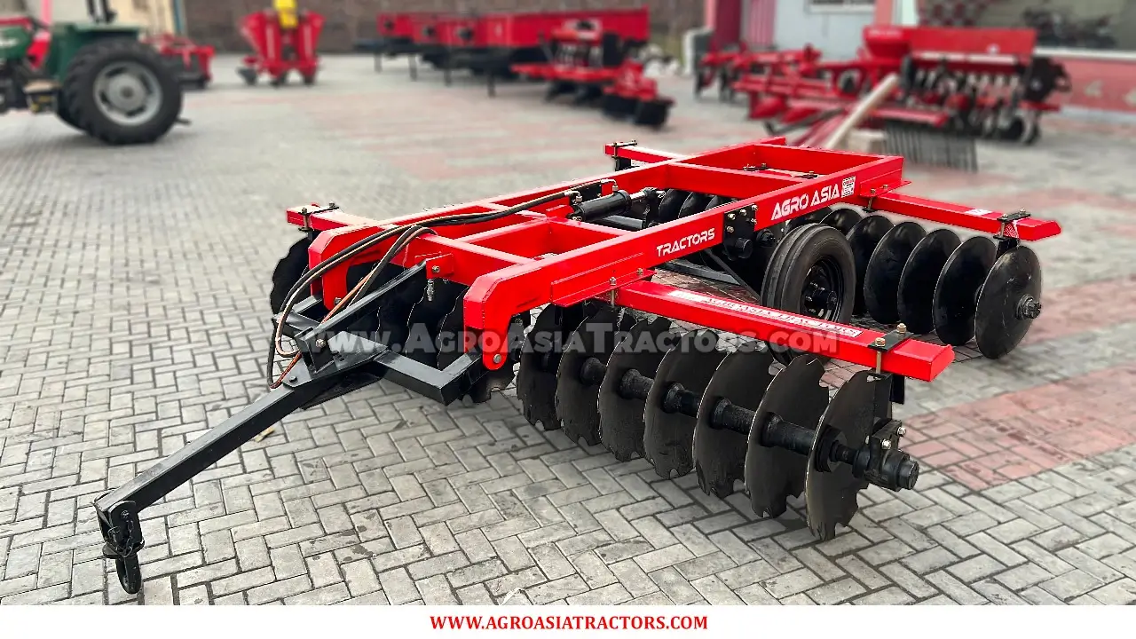 Agro Asia Hydraulic Disc Harrow is a 3-point hydraulic lift disk blade tool used for deep soil tillage purposes. It finely cuts unwanted weeds by entering and mixing the soil to improve its organic nutritional value.